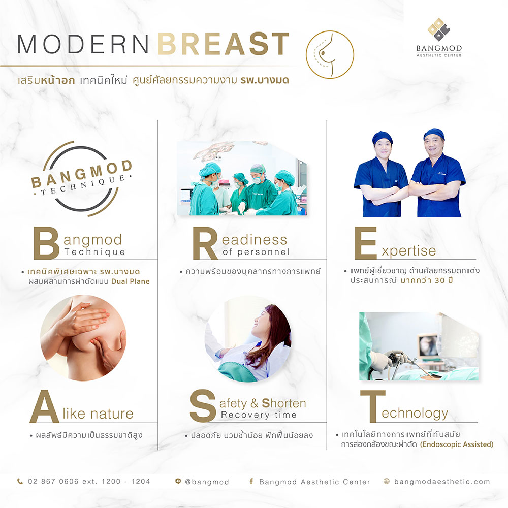 • ด้วย 3 เทคนิคเฉพาะของเทคนิค “Modern BREAST” ได้แก่ เทคนิคบางมดเทคนิค Dual Plane ร่วมกับ เทคนิคส่องกล้อง (Endoscopic Assisted) ทำให้ “แผลเล็ก เจ็บน้อย หายเร็ว และผลลัพธ์ดูเป็นธรรมชาติ”